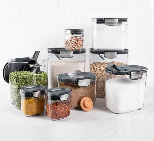 The FreshSeal 9-Pieces Clear Kitchen Container Set includes storage containers for flour, granulated sugar, brown sugar, powdered sugar, coffee and a mini keeper. Each FreshSeal features its own specialized, integrated tool. This set includes six stackable food storage containers with easy-catch lids and silicone seals for airtight storage to keep your kitchen organized and your food fresher longer.